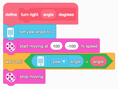 Create a My Block by going to the My Block section of the Block Palette and clicking Make a Block. Start by labelling it turn right and then add a number or text input labelled angle. This will be the target angle.